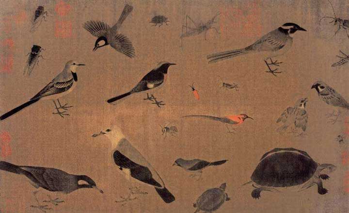 事实上,宋代绘画何以能够达到“模拟形似”(mimetic, form-likeness)?实在难以言传。【图1-6】以传为黄筌(903—965)所作的《写生珍禽图》【图1-7】为例,画中雀鸟造型及嘴、头、身、尾、毛色等细部全为图式绘本与线钩描本,与其称之为“模拟形似”(mimesis),倒不如称之为有助记忆的图式(memonics),即利用记忆公式,以线条用笔(brushed lines)来“模拟仿照”。所以谢赫说,“应物象形”、“随类赋彩”。循科学角度而言,大自然之中根本没有线条。在几何学上,线不过是点在空间移动的痕迹。然而,中国的图式绘本与线钩描本却有助唤起观者的记忆,借此引发对自然原物的联想。画家在描绘笔下物象之余,独特的用笔亦隐含个人意趣,(顾恺之)所谓“以形写神”,与书家写宇无异。绘画发展至后世,文人画家放弃形似,转而追求书法性用笔,以期表现自我。【图1-8】由于个人意趣与历史承传已同时见诸用笔之中,画家的意向可借所选用的笔法得而知之。因此,中国画家的“用笔”除带出“状物形”画风外,亦另有“表我意”的寄托。