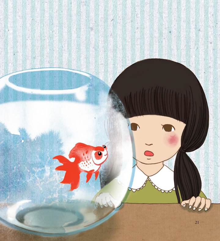 阿香好奇地看着金鱼。金鱼也看着她,不断摆动着尾巴,好像是在对她撒娇。