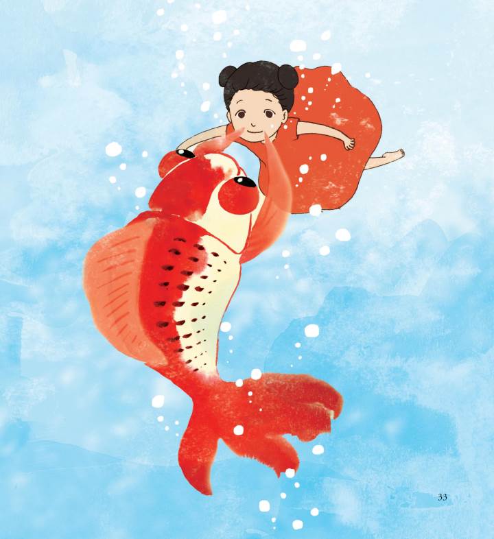 阿香被这条金鱼的模样深深吸引住了。她尽可能地靠近,细细地看,发现金鱼嘴巴弯弯的,看起来就像在微笑。