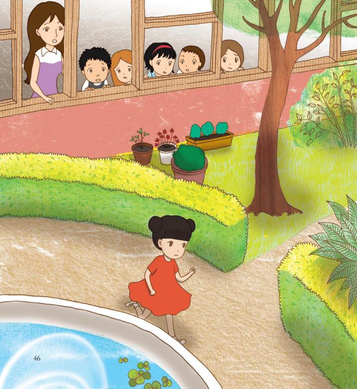 这时候,老师也急忙来到窗户旁边。这个奇怪的女孩一会儿在喷水池边上走来走去,一会儿又跑到旁边草丛里钻来钻去。