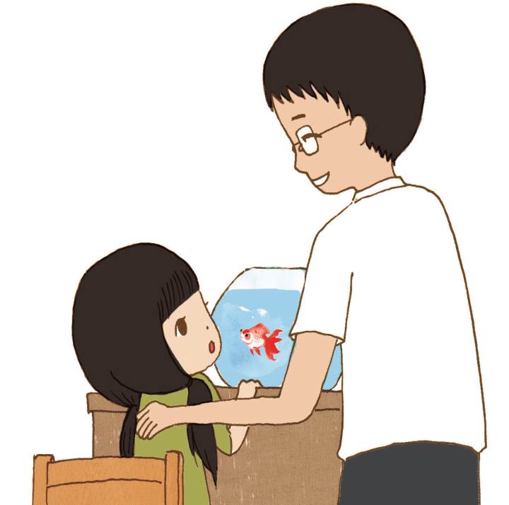 这时候,刚下班回来的爸爸看到阿香背着书包趴在金鱼缸前。