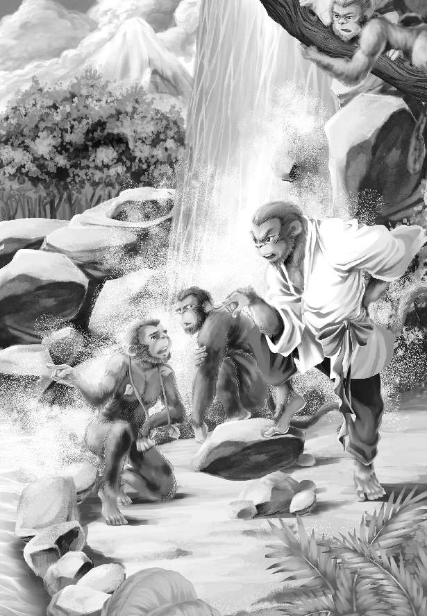 那只年长的猕猴走上石阶说道:“我们已经许下承诺,谁能有本事进得来,出得去,就拜他为王。现在石猴进来又出去,出去又进来,找了这一个洞天给我们玩耍安身,我们何不拜他为王?”众猴一听,登时排列成队俯首大拜,口中高呼:“大王!”至此,石猴便成为众猴之首,更名为美猴王。之后的五百年里,他日夜带领众猴游乐于花果山间,独自为王,怡然自得。