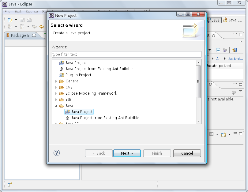 (3)在打开的“New Project”对话框中单击“Java”选项,然后在下面打开“Java Project”选项,选择后单击“Next”按钮,如图2-23所示。