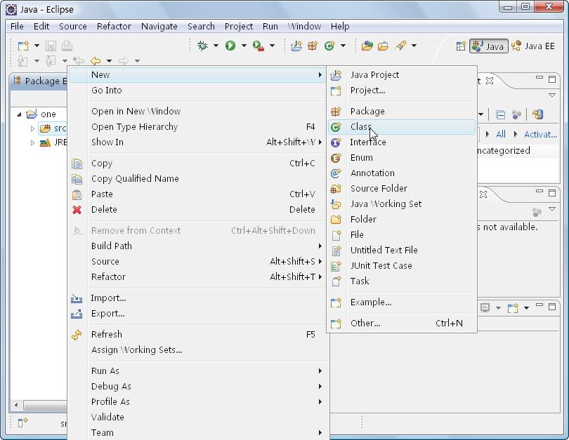 (5)在Eclipse的左侧双击项目“One”,选择“str”选项,单击鼠标右键,在弹出的快捷菜单中,选择“New/Class”命令,如图2-25所示。