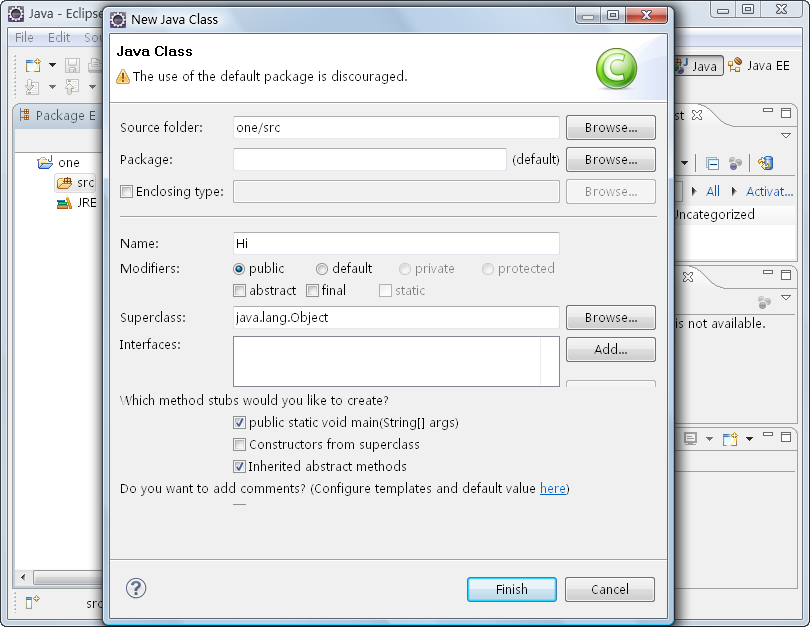 (6)打开“Java Class”对话框,在“Name”文本框中输入类名,如“Hi”,选择