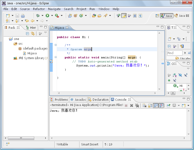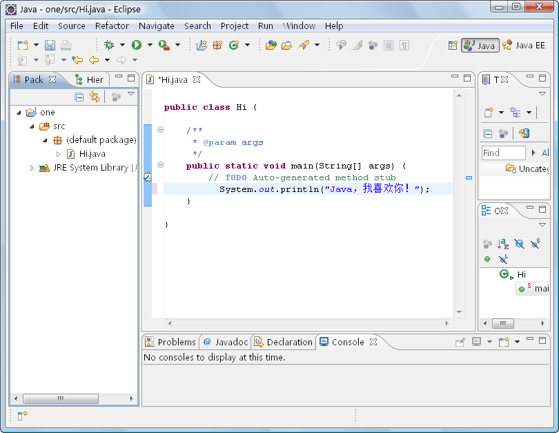 注意: 对于初学者来说,建议使用Eclipse新建项目后,直接使用Eclipse编辑器全部手动编写代码,这样可以帮助我们快速掌握Java语言的语法知识,通过实例巩固所学的知识。