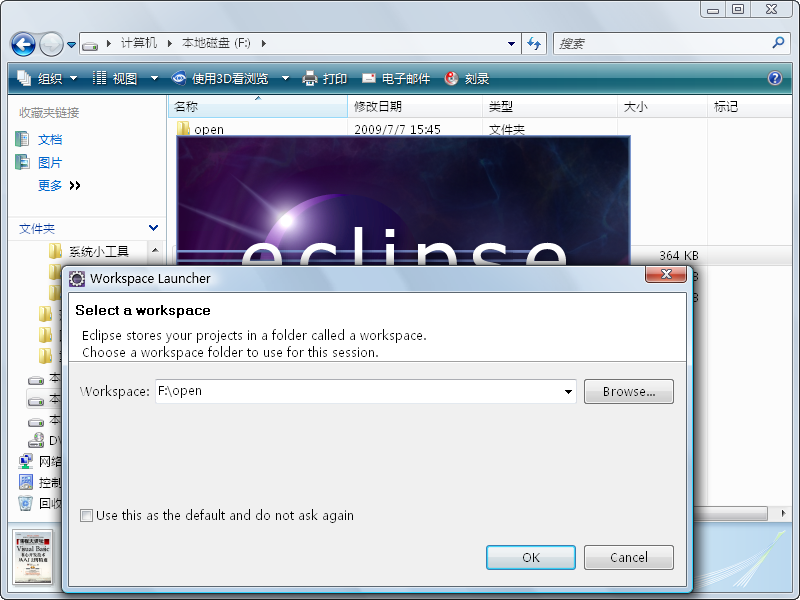 (1)在任意一个盘里新建一个文件夹,如这里在F盘新建“open”文件夹,然后在“Workspace”文本框中输入地址,单击“OK”按钮,如图2-21所示。
