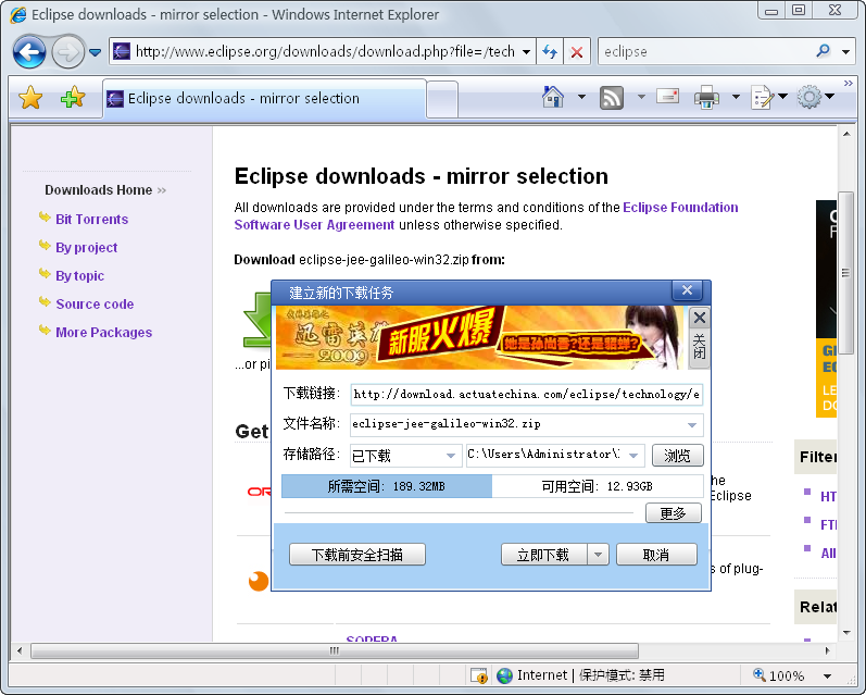 (3)单击“[China] Actuate Shanghai(http)”超级链接开始下载Eclipse,笔者使用了“迅雷”进行下载,如图2-20所示。