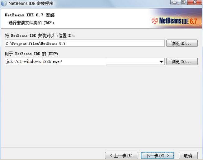 (4)打开“NetBeans IDE 6.7安装”对话框,在“将NetBeans IDE安装到以下位置”文本框中输入下载位置,然后在“用于NetBeans IDE的JDK”文本框中设置JDK的位置,单击“下一步”按钮,如图2-36所示。