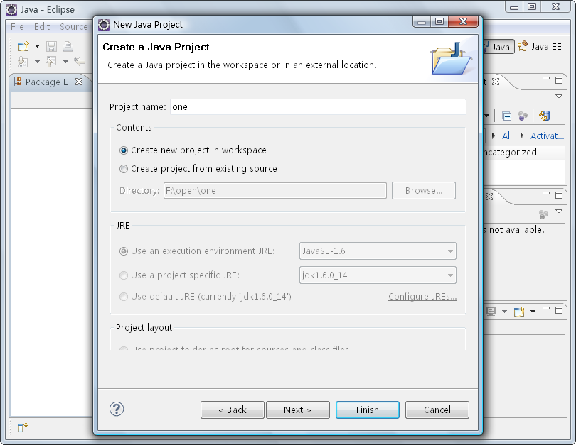 (4)在打开的对话框中,在“Project name”文本框中输入项目名称,例如输入“one”,输入完成后单击“Finish”按钮,如图2-24所示。