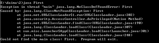 这样做会导致Java解释器不在当前路径下搜索Java类,此时如果在文件first.class所在路径运行java first会出现如图2-47所示的错误提示。