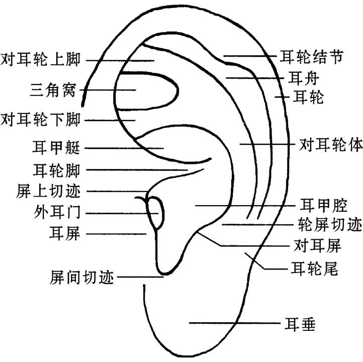 耳郭分为凹面的耳前和凸面的耳背。耳前的表面解剖部位如图2-1所示。