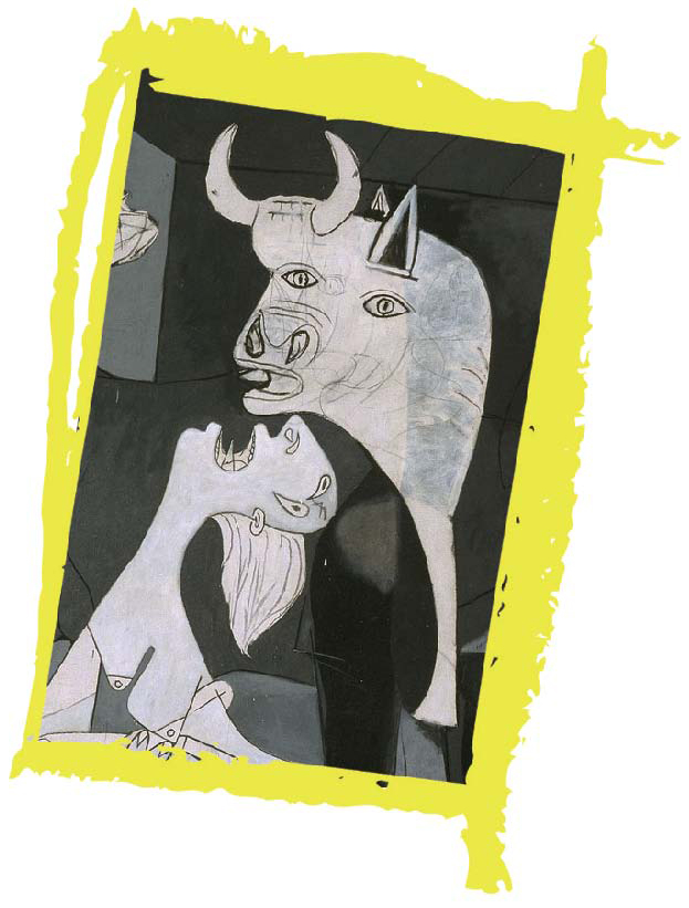 第一部分,一个年轻的母亲抱着刚被炸死的孩子,仰天长号,痛不欲生,在她的上方,画着一头面目狰狞、凶残无比的大公牛,象征着残暴的德国法西斯势力。