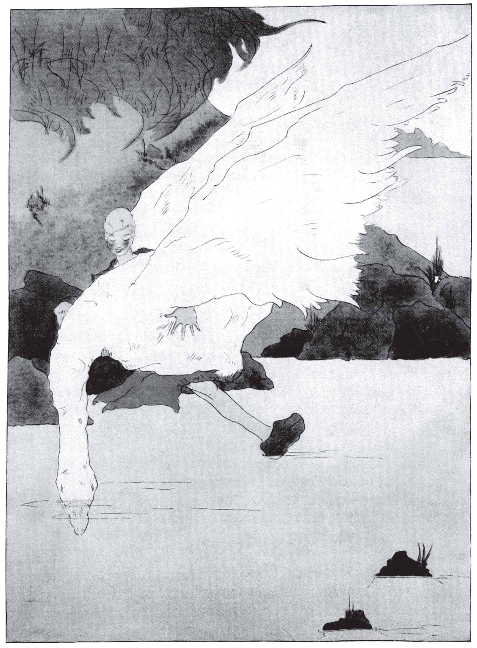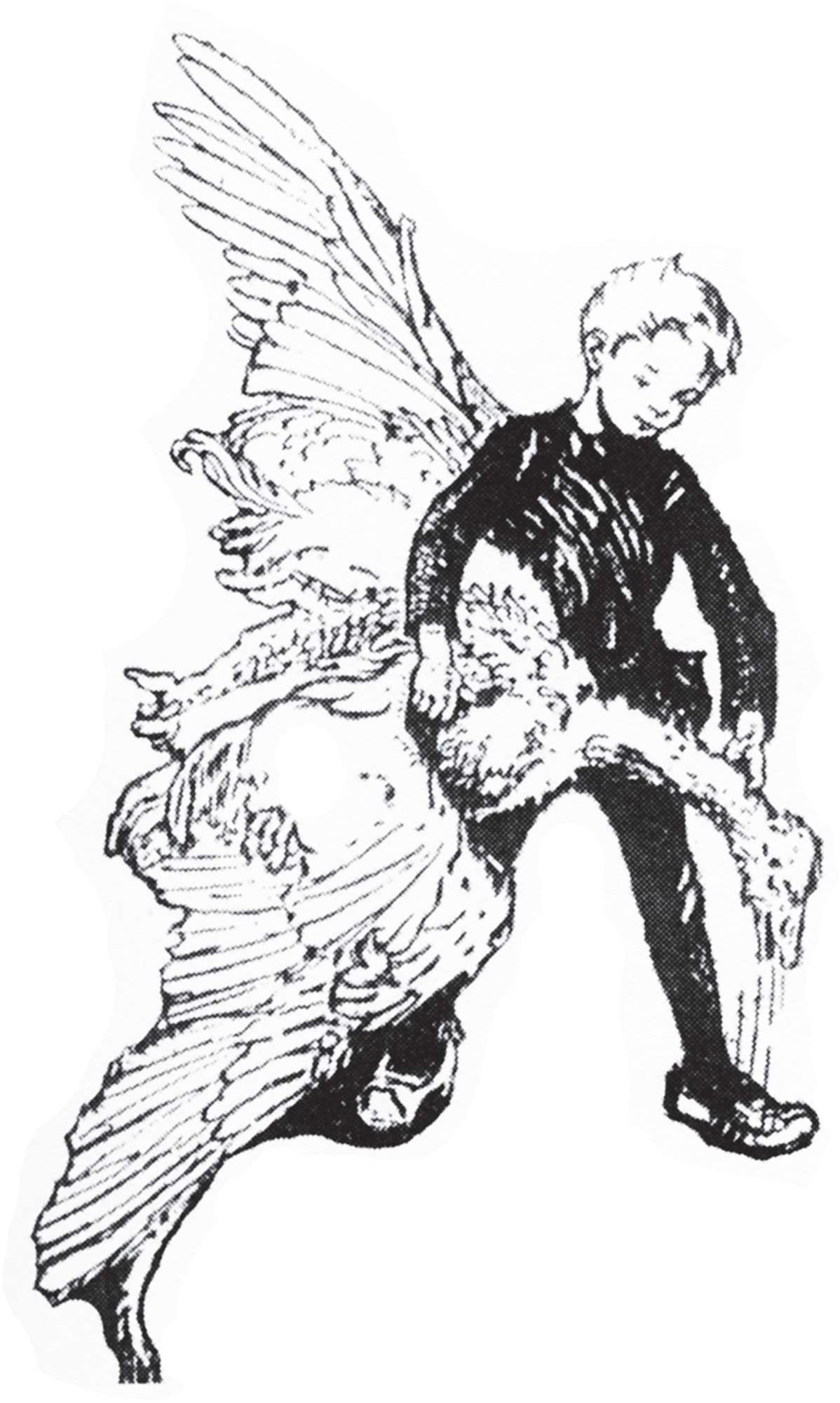 He flew slowly behind the rest while he deliberated whether he should turn back or continue. Finally, the little creature that he carried on his back said: "Dear Morten Goosey-gander, you know well enough that it is simply impossible for you, who have never flown, to go with the wild geese all the way up to Lapland. Won't you turn back before you kill yourself?"