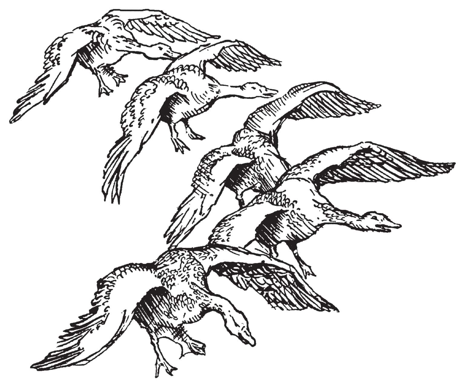 When the wild geese had stopped in front of them, they curtsied with their necks many times, and the goosey-gander did likewise many more times. As soon as the ceremonies were over, the leader-goose said, "Now I presume we shall hear what kind of creatures you are."