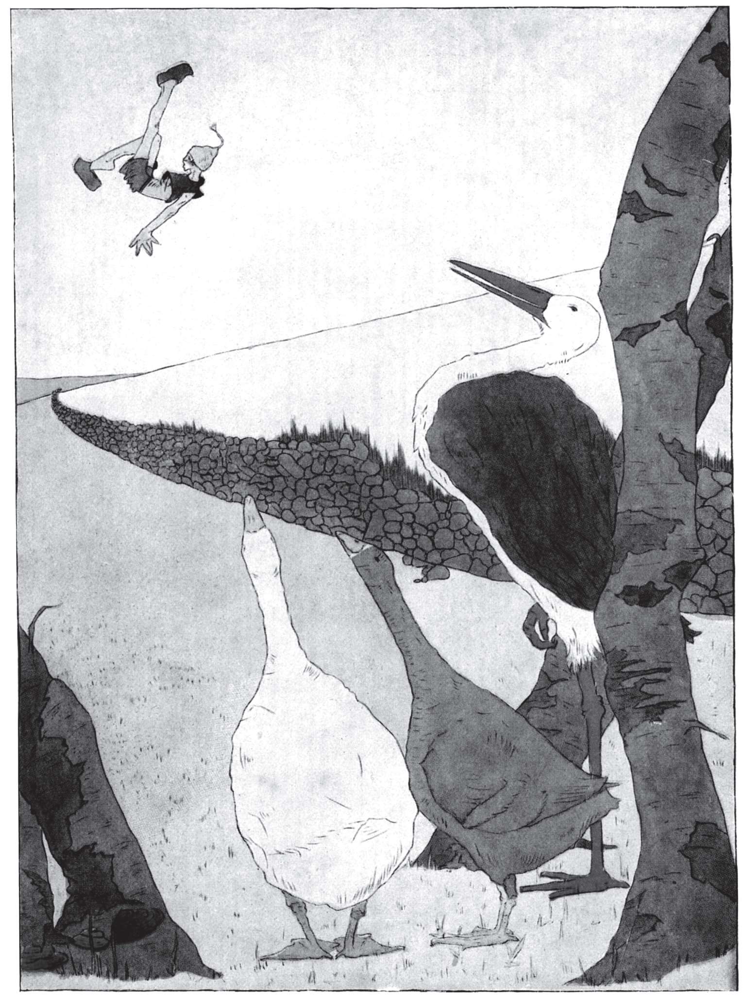 Finally the boy threw down his pipe and jumped from the bush. He had seen Akka, and all the wild geese, coming toward him in a long row. They walked so uncommonly slow and dignifie-like that the boy immediately understood that now he should learn what they intended to do with him.