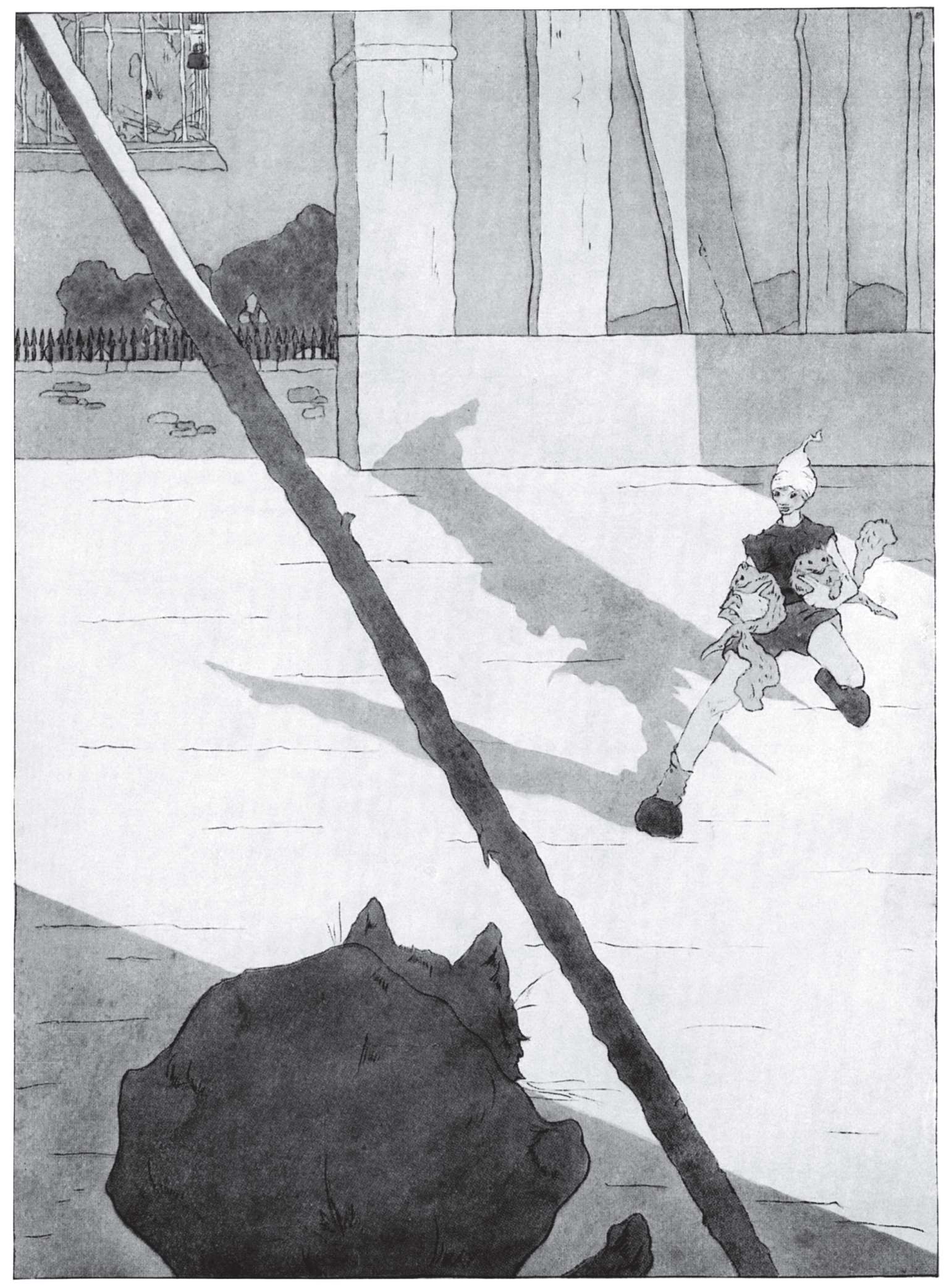 The old grandma stood very still, and it did not look as if the elf had noticed her. He was just going to lay one of the babies on the ground so that he could swing himself up to the cage with the other one—when he saw the house cat's green eyes glisten close beside him. He stood there, bewildered, with a young one in each hand.