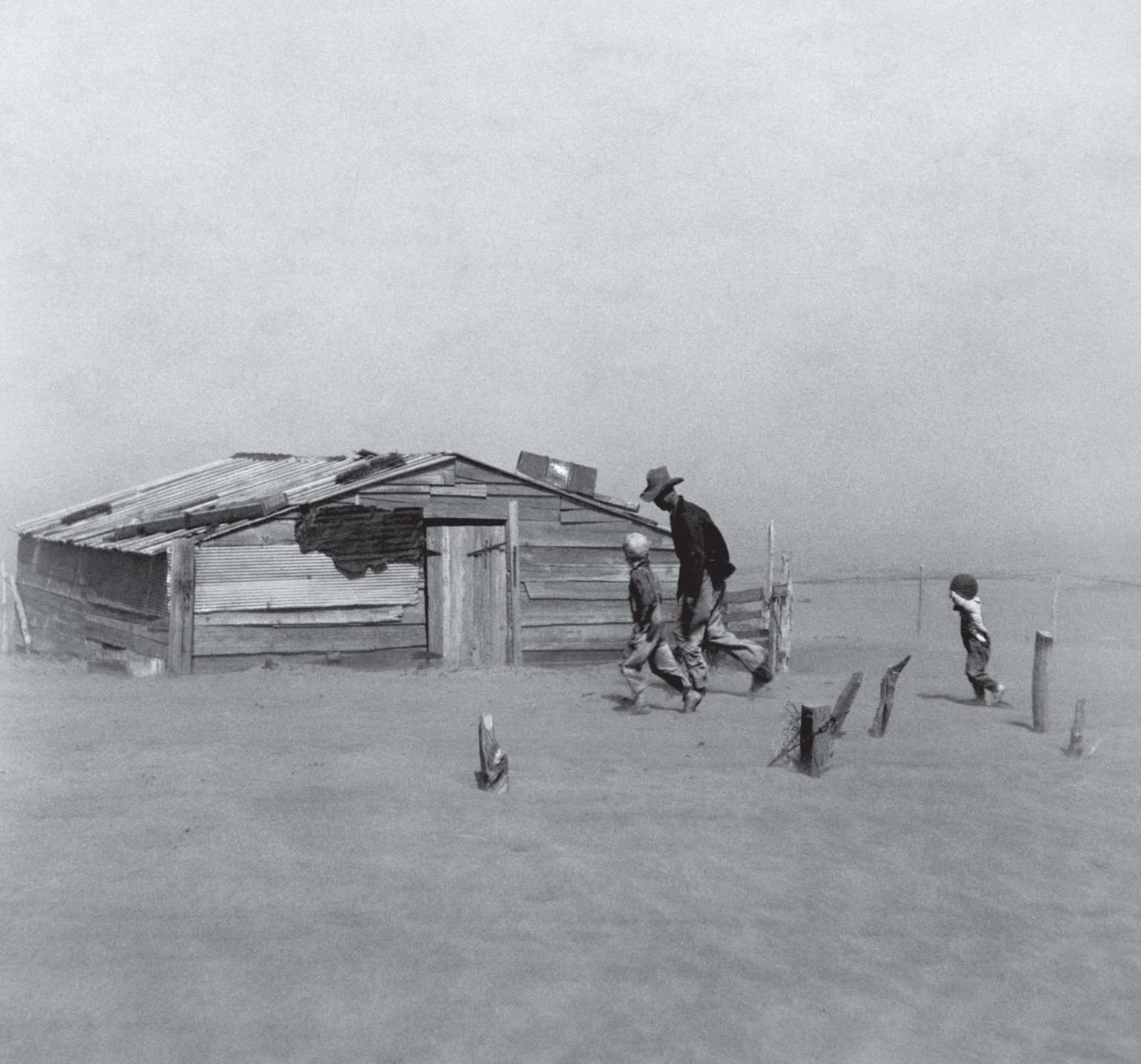 Agriculture also suffered terribly, and the suffering was increased by violent wind and dust storms that swept across the southern Great Plains in what became known as the “Dust Bowl” throughout the 1930s. Crops were destroyed, cars and machinery were ruined, people and animals were harmed. Around 800,000 people, often called “Okies”, left Arkansas, Texas, Missouri and Oklahoma during the 1930s and 1940s. Most headed farther west to the land of promise, California.