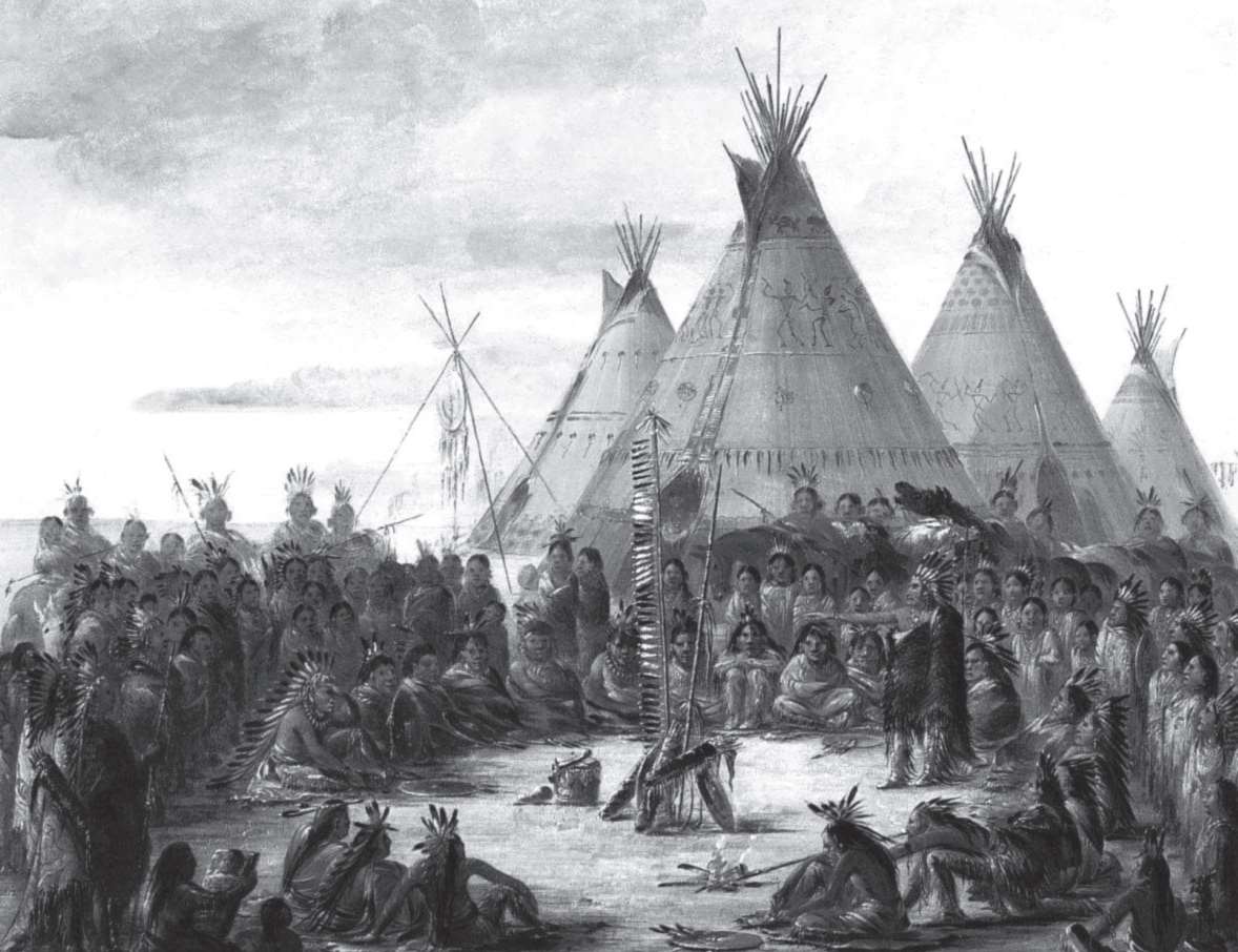 However, the cultures of the Great Plains have come to epitomize “Indians” in the American imagination, partly because they put up the longest fight against westward expansion. Before the arrival of European traders and explorers, the area was settled by hunters and farmers. After European contact, and especially after Spanish colonists brought horses to the region in the 18th century, the peoples of the Great Plains became much more nomadic. Groups like the Crow, Blackfeet, Cheyenne, Comanche and Arapaho used horses to follow great herds of buffalo across the prairie . The most common dwelling for these hunters was the teepee , a bison-skin tent that could be folded up and carried anywhere.
