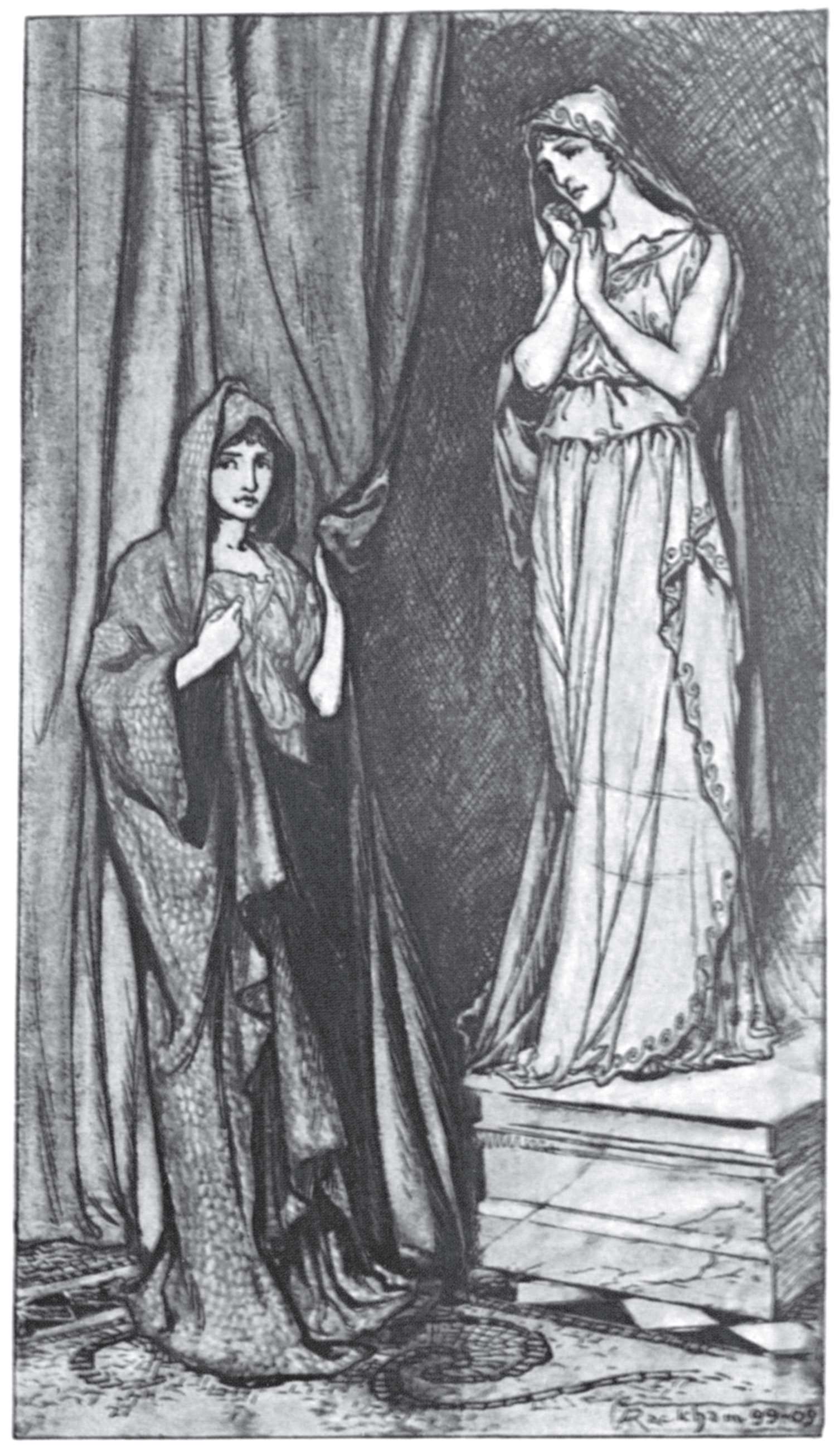 Perdita, who all this time bad been kneeling, and beholding in silent admiration the statue of her matchless mother, said now, "And so long could I stay here, looking upon my dear mother.""Either forbear this transport," said Paulina to Leontes, "and let me draw the curtain or prepare yourself for more amazement. I can make the statue move indeed; ay, and descend from off the pedestal, and take you by the hand. But then you will think, which I protest I am not, that I am assisted by some wicked powers.""What you can make her do," said the astonished king, "I am content to look upon. What you can make her speak, I am content to hear; for it is as easy to make her speak as move."
