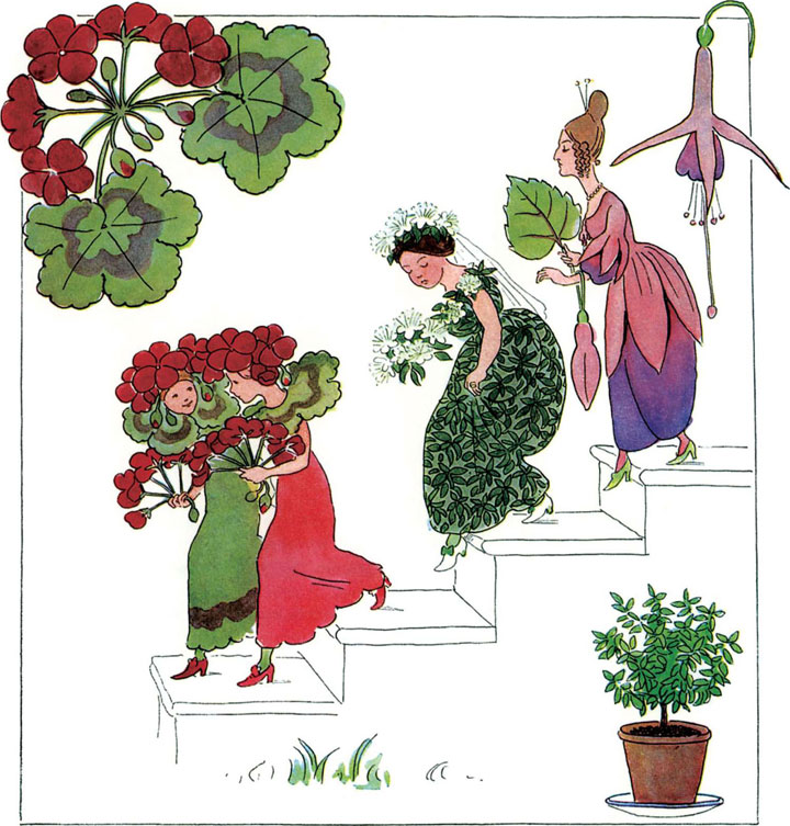 就在这时,小木屋的门开了。令丽莎感到惊诧的是,家里所有的植物都小心翼翼地走下了台阶。走在前面的是两位天竺葵小姐,中间是丰满小巧的桃金娘太太,由贵妇人倒挂金钟殿后。
