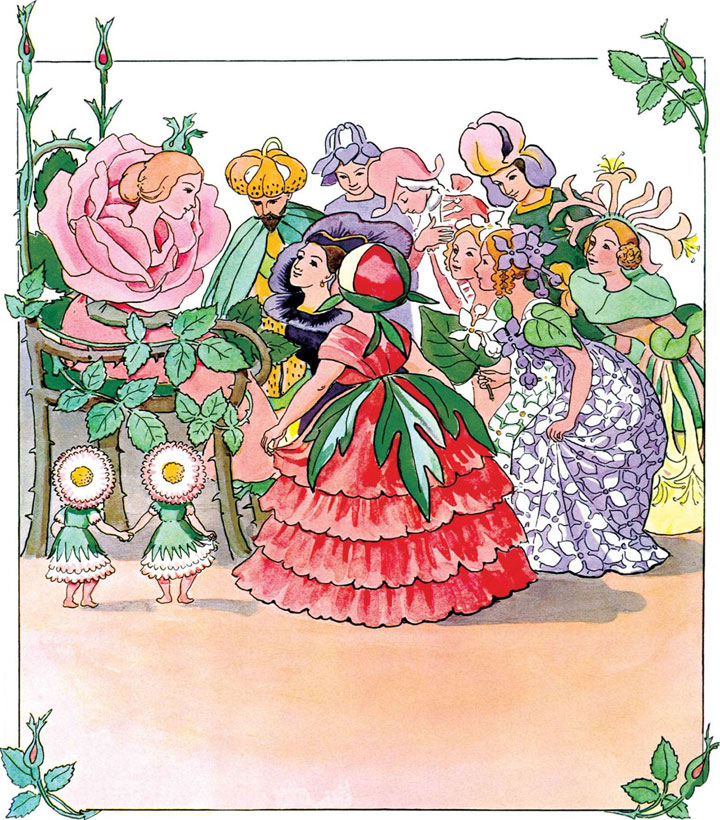 在花园的高处,玫瑰女王端坐在宝座上,欢迎大家的到来。大臣们众星捧月,簇拥在女王的周围——三色堇夫人、牡丹夫人、紫丁香夫人、忍冬夫人、花贝母大人、荷包牡丹大人、鸢尾爵士、漂亮的小耧斗菜,以及两个小雏菊侍女。