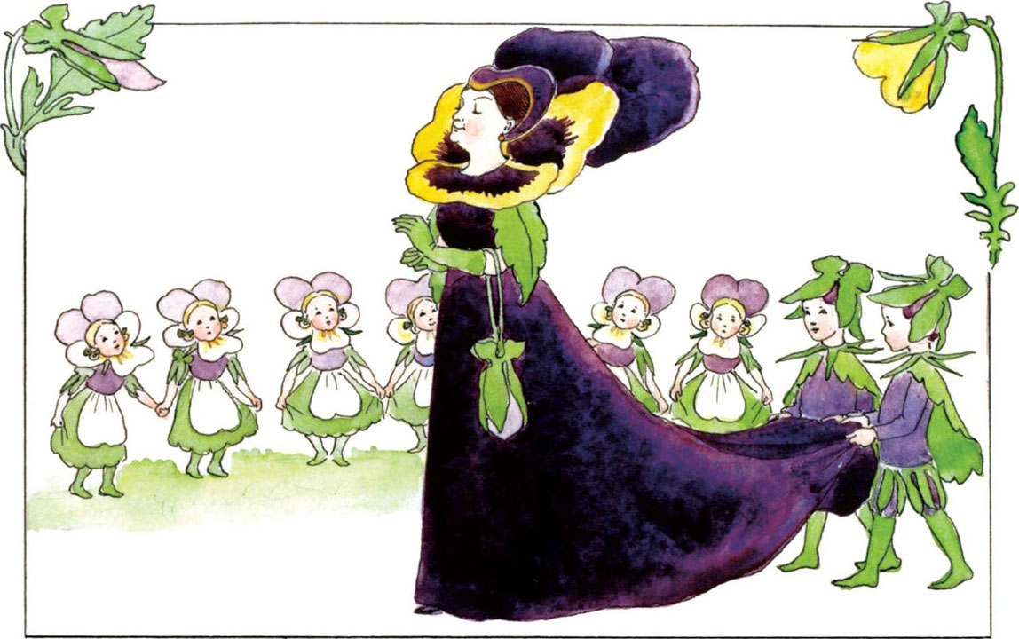 在开派对的那一天,所有的小紫罗兰都穿上了最漂亮的衣服。这时,他们的阔亲戚三色堇夫人来了。啊,她穿着长长的、华贵的天鹅绒袍子,袍子上装饰着美丽的黄领子。她标致的脑袋上带着冕状头饰。她高昂着头,语气生硬地对小亲戚们发号施令。
