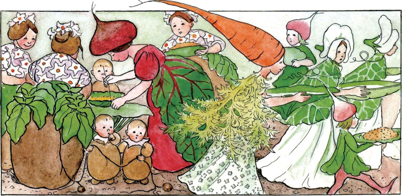 丽莎返回花园,发现花儿们都在忙个不停。菜园里,马铃薯太太和甜菜根太太正忙着准备食物——蜜露和芬芳的花粉;而红皮萝卜、胡萝卜和豌豆花则端着满当当的盘子往来穿梭。