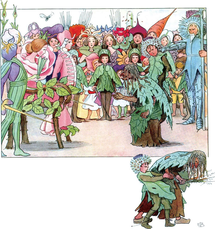 玫瑰女王竭力安抚大家,可是她的声音被嘈杂声给淹没了。最后,蓟一把抓住惹祸的牛蒡男孩,把他举了起来。