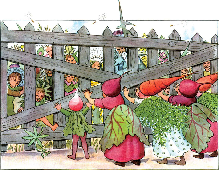 一个牛蒡男孩爬到了栅栏上,朝花儿们抛掷出带刺的种子。那些种子粘到了她们的裙子上。女士们尖叫起来,倒挂金钟夫人昏了过去。桃金娘太太歇斯底里地叫着。两位骑士——鸢尾爵士和荷包牡丹大人——拔出剑来。