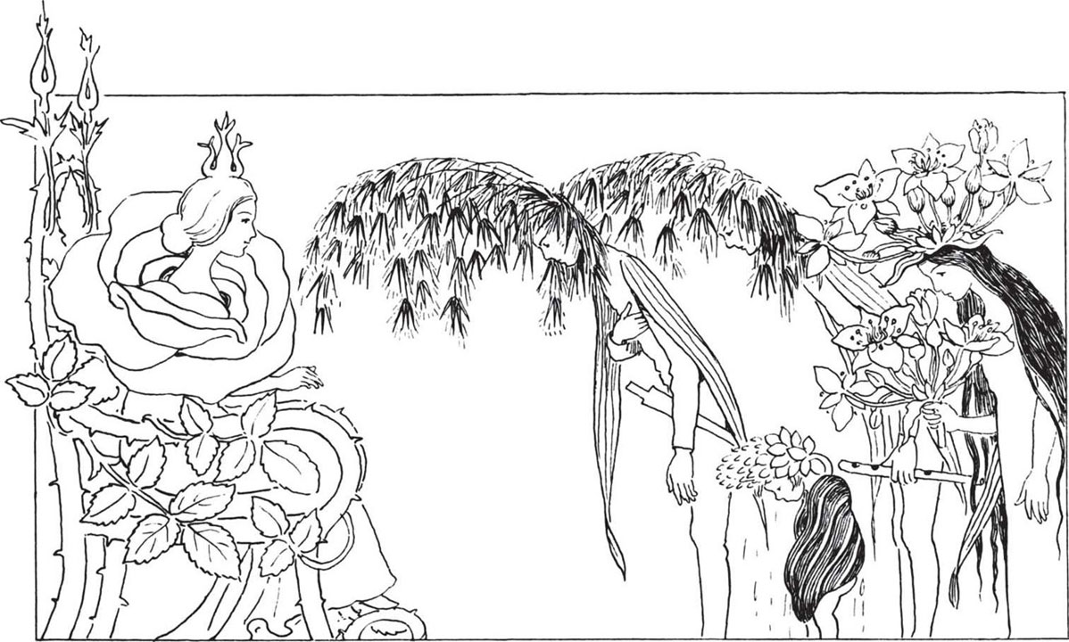 玫瑰女王拍了一下手,吩咐乐师们:“演奏!”蟋蟀、蜜蜂和野蜂立即弹奏起一首欢快的乐曲。羽衣草和豌豆花跑前跑后,为客人们端上茶点。
