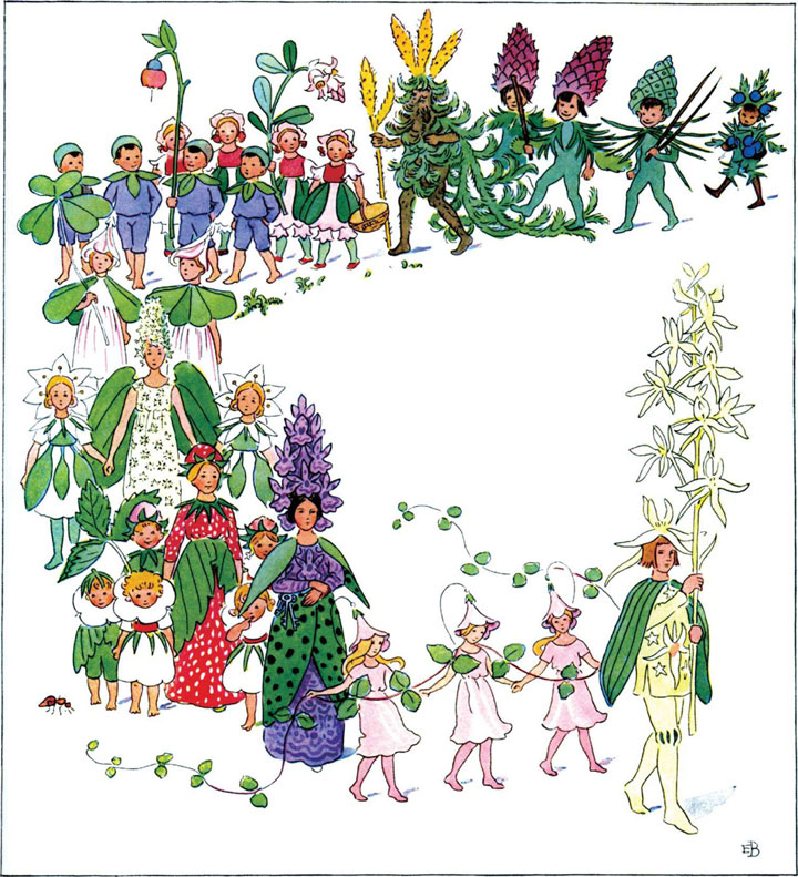 接着,森林中的花儿们登场了,她们静静地排成一行,由蝴蝶兰在前面带队。紧随其后的是手拉着手的三对北极花。接着是可爱的斑点兰,再往后是野草莓和她的孩子们,然后是舞鹤草、红花酢浆草、蓝莓、酸果蔓,还有石松和他的一大家子。石松后面是云杉和松球果。排在最后的是活泼的小刺柏。