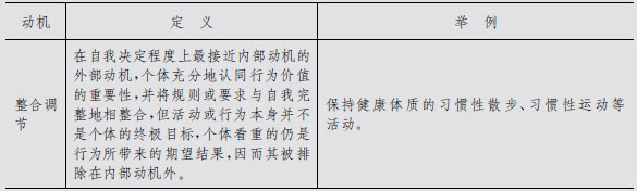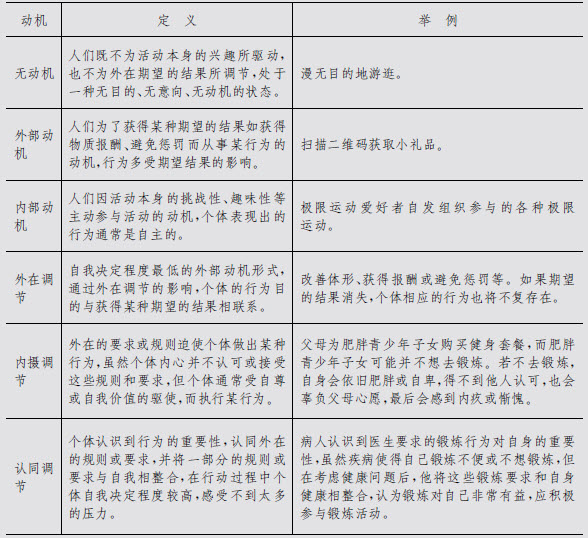 根据个体自我决定的不同程度,外部动机又可进一步细分为外在调节、内摄调节、认同调节和整合调节。外在调节和内摄调节更多的是受外界环境因素所驱动,自我决定的程度相对较低,因而被归类为控制型动机(controlled motivation),如改善体形、获取报酬、逃避惩罚、避免内疚、羞耻等。认同调节和整合调节具有较多的自我决定意识,受外在环境的规则或要求的影响较大,在很大程度上将外在环境规则或要求与自我相整合。内部动机源于活动行为本身,因而认同调节、整合调节及内部动机也被称为自主型动机。但认同调节和整合调节仍然属于外部动机,因为它们还没有达到完全自发的状态,并非以活动或行为本身为出发点,这些动机推动的行为仍然是为了达到某种期望的结果,如病人为了重获健康而进行康复锻炼。