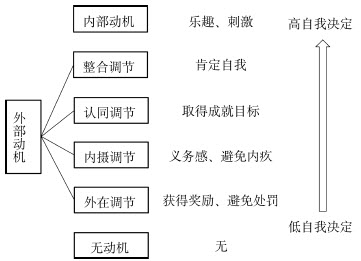 自我决定理论最早由美国心理学家Deci L.Edward和Ryan M.Richad于20世纪80年代提出的一种认知动机理论,该理论主要研究人类行为自我决定的程度或自愿程度,强调自我决定对行为动机的调节作用,同时注重外界环境因素对个体自我决定的影响。自我决定理论从人本主义视角出发,认为人类有一种积极的心理成长、发展和自我决定的潜能,当社会环境因素具备开发这些潜能的能力时,行为的自我决定程度较高,人们的行为也往往由内部动机激发并维持,或是有利于外部动机向内部动机的转化;而当社会环境因素阻碍这些潜能的发展时,行为的自我决定程度常会受抑制,人们的行为往往由外部动机激发,维持的时间通常较短,甚至是无动机,人们的行为也得不到激发。