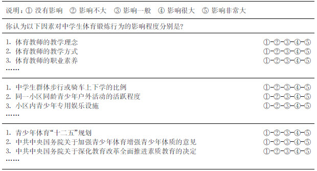 在锻炼行为生态学模型的理论基础上,邱茜(2015)通过调查中学生锻炼行为的因素、特征及差异,分析各因素与中学生锻炼行为之间的关系,构建了适用于上海市中学生锻炼行为的生态学模型问卷(见表2-7)。该问卷为上海市中学生的体质健康促进工作提供指导,为营造适于中学生积极锻炼的环境和氛围提出针对性的策略和建议。此问卷具有良好的信效度,包括5个维度,即从个体层面、家庭层面、学校层面、社区层面、政策层面对被试展开调查,其得分采用5级计分标准,得分越高,说明个体认为某因素影响中学生参与体育锻炼的程度越高。
