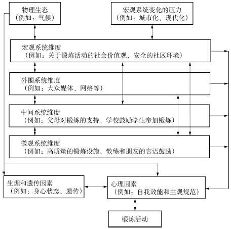 除了环境情境的四个层次,锻炼活动生态学模型还综合考虑了物理生态、生理遗传因素、宏观系统变化的压力和心理因素等。例如,如果某个楼梯是通向个体办公室的唯一途径,那么此种环境情境会增加走楼梯的概率,对个体行为产生直接的影响;而如果某楼梯并不是通向办公室的唯一途径,但楼梯装饰较好、有提醒人们锻炼身体的醒目告示,那么这可能会成为影响个体的心理因素,改变个体态度,进而间接影响个体走楼梯的行为。
