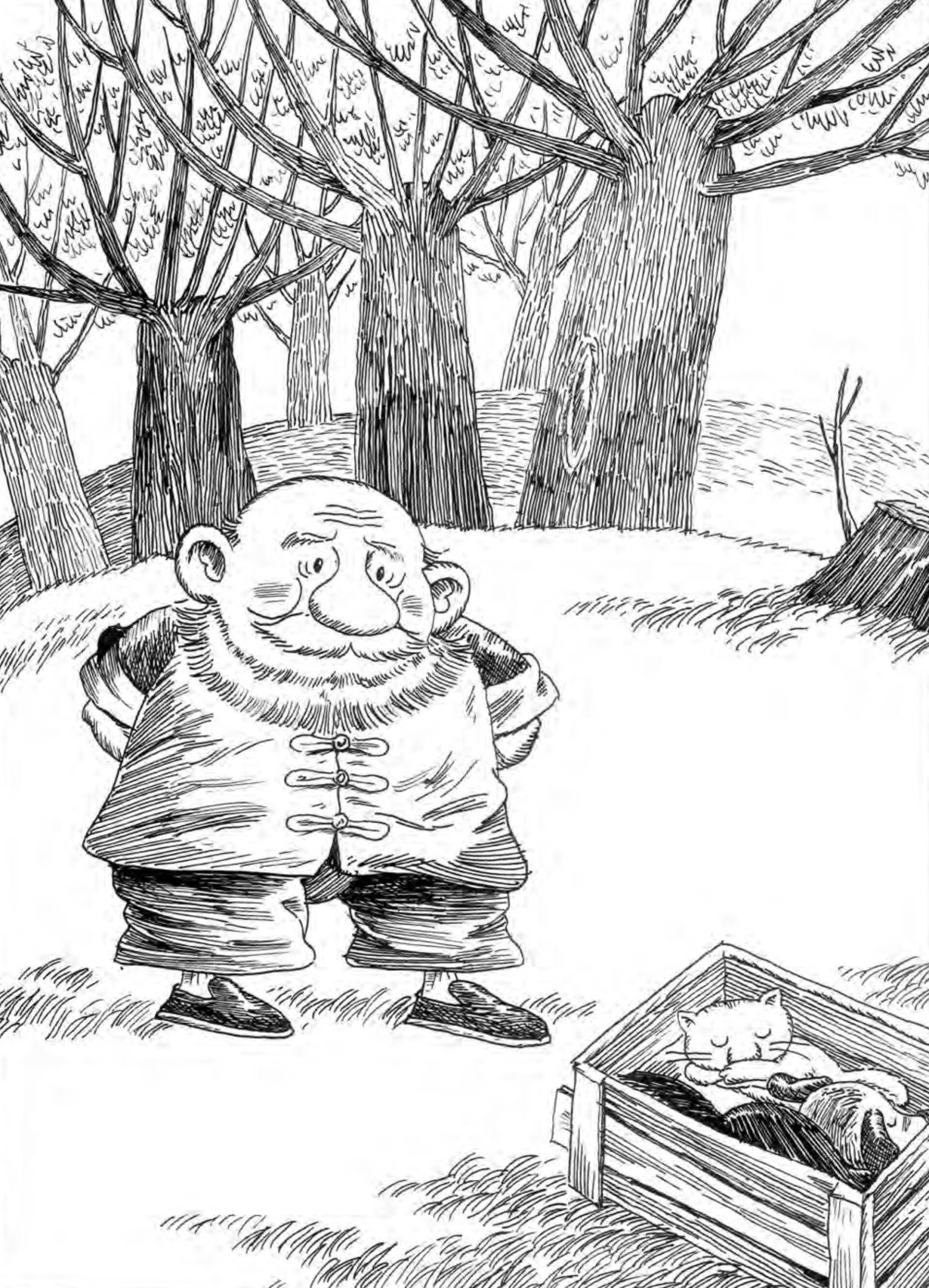 早晨,倔老头一觉醒来,他眯缝着的眼睛瞪着天花板连转三圈,才又想起自己是睡在和捣蛋顽皮一起造的新房子里。倔老头的胡子跳了一下,又跳了一下,便赶紧下床走到隔壁,去看捣蛋和顽皮。他推门过去朝两张小床上一看,咦,小床上怎么空空的?倔老头心里一急,以为捣蛋和顽皮趁他夜里睡着逃走了,便一拍脑袋,失望地双手抱腿蹲了下来,很大很大的人像很小很小的人一样,低着头难过极了……忽然,有“呼噜呼噜……”的声音响起来,倔老头奇怪地抬起头来四下里看,一下就看见了躺在地上的捣蛋和顽皮。倔老头赶紧走过去,像上回一样伸出粗大的手,先轻轻托起捣蛋,把它放到小床上,然后再轻轻托起顽皮,把它放到另一张小床上。干完这些,倔老头就悄悄退出屋子,走到房子外面。