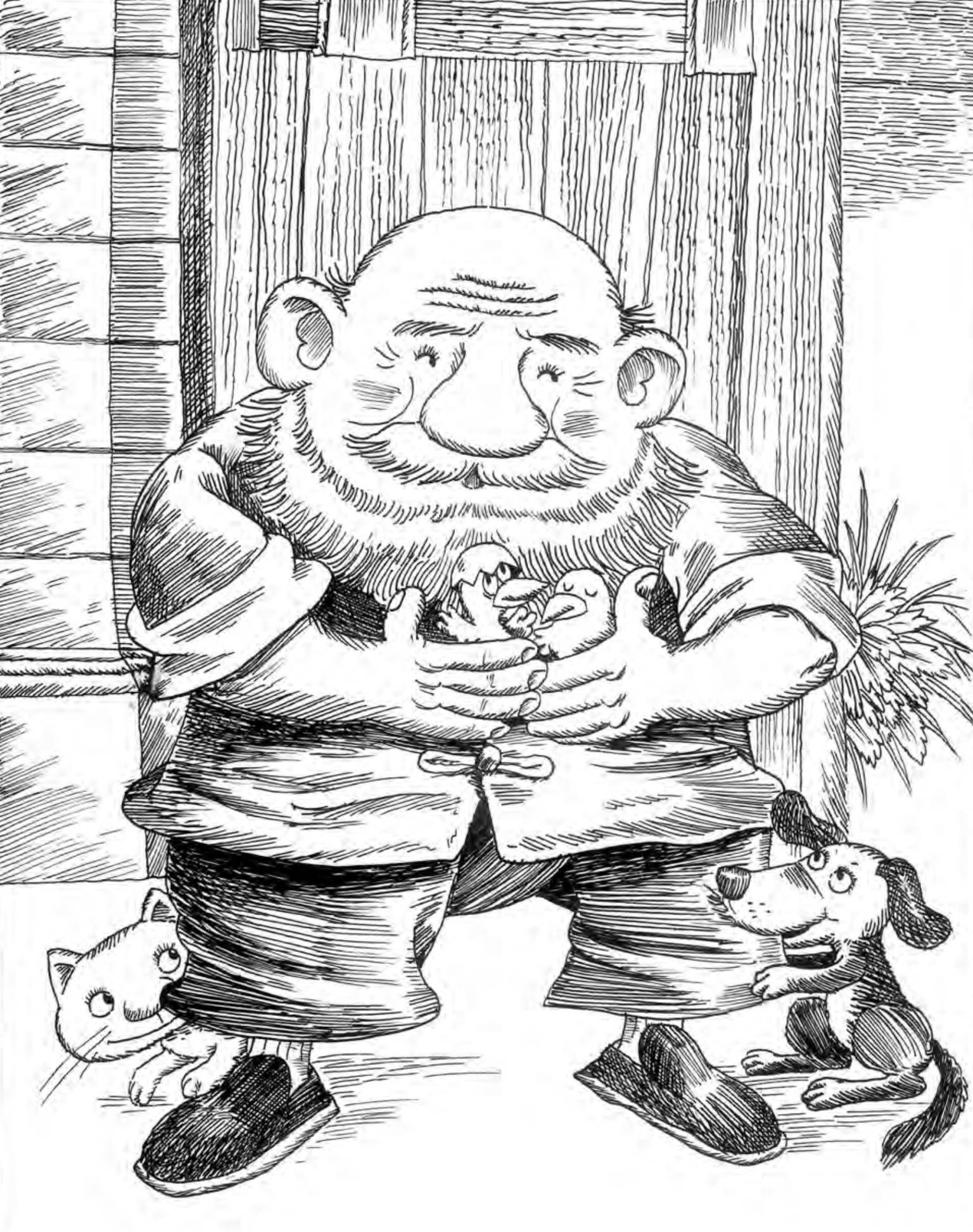 直到顽皮抬起前爪使劲去拍那扇门,直到捣蛋歪过脑袋用力去撞那扇门……倔老头才似乎刚刚想起它们正着急地等待着。他连忙伸出手,伸进小房子,从里面拿出……拿出两只……两只毛茸茸的小鸟,一个头上顶着一小片白色的蛋壳,一个连眼睛都还没有睁开哩!