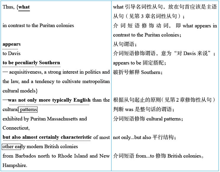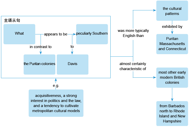 因此,那些{和清教徒殖民地形成对比的、在Davis看来是特别有南方特点的}东西——即贪婪、对于政治和法律的强烈兴趣以及培养大都会文化模式的倾向——不仅比{清教徒的马萨诸塞州和康涅狄格州所展现出来的}文化模式有更典型的英国特征,而且几乎肯定是{从巴巴多斯北部到罗德岛和新罕布什尔的}{大部分其他早期现代}英国殖民地的特点。