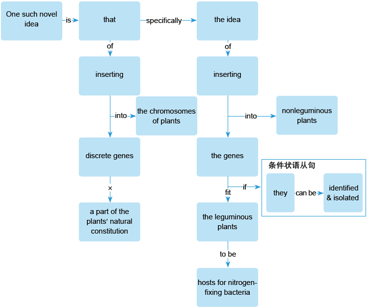 一个这样新奇的想法是把{不是植物自然构造的一部分的}分离基因植入到植物的染色体中:具体来说就是这样一个想法,把那些{使得豆科植物成为固氮菌宿主的}基因植入到非豆科植物中,如果它们(这些基因)能被识别和分离的话。因此就有了对豆科植物的密集研究。