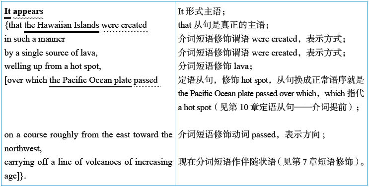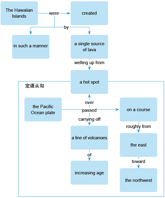 这句话没有明显的逻辑关系,主要强调了多概念间的关系:太平洋板块经过hot spot,产生了夏威夷岛。