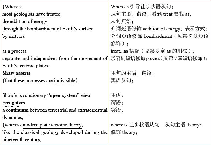 Whereas表示对比关系:第一句对比了most geologists和Shaw的观点,通过separate和indivisible这对反义词也验证了对比关系:most geologists认为地球板块运动和地外行星撞击无关,而Shaw认为这些过程是有关的;第二句对比了Shaw的观点和modern plate tectonic theory,Shaw认为地外行星撞击和地球板块运动是一个连续的整体,而modern plate tectonic theory认为地球板块的变化和灾难性的行星撞击无关。