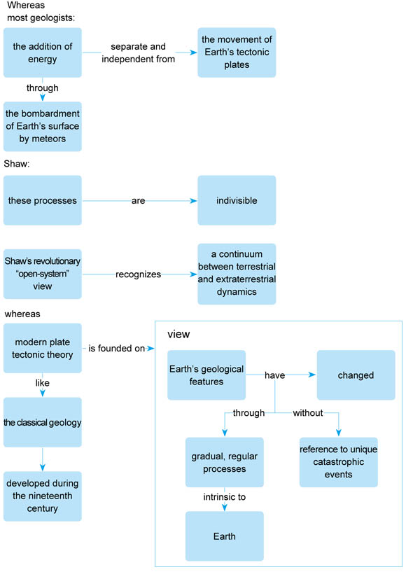 虽然大部分地理学家认为{通过[流星在地球表面的撞击]来增加能量}是一个独立于地球构造板块运动之外的过程,Shaw却认为这些过程是不可分割的。Shaw革命性的“开放系统”观点发现地球和地外运动是连续的,而现代板块构造理论,和19世纪发展的经典地质学一样,都是基于这样一个观点:地球的地质特征是通过地球内部逐渐的常规过程而改变的,与特殊的灾难性事件没有关系。