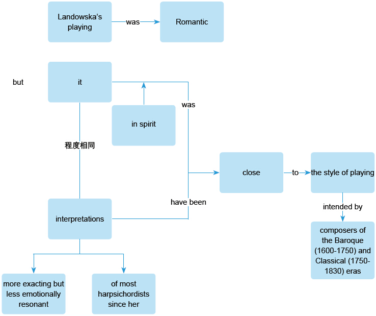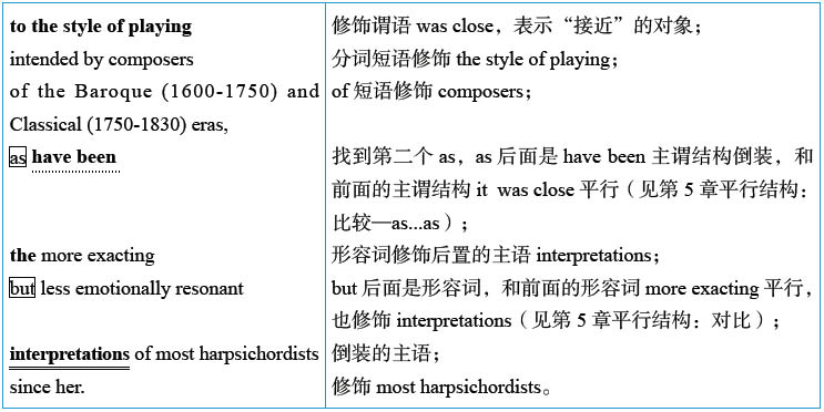as...as表示同级比较关系,即相同关系:Landowska和她之后的harpsichordists同样接近巴洛克时代和古典主义时代的演奏风格;