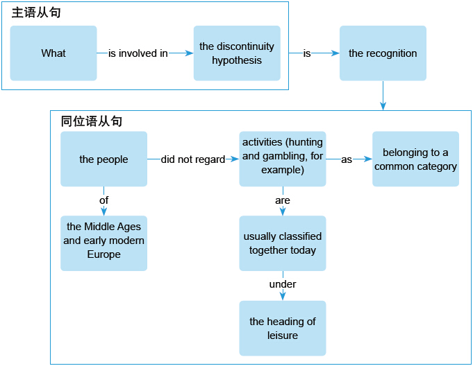 discontinuity表现了不同的关系,往下看会发现:我们现在通常把一些活动归到“娱乐”的类别,而在以前(中世纪和早期的现代欧洲)这些活动并不被归为一类。
