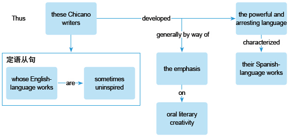 因此普遍来说,正是通过强调口头文学创造力的方式,这些{英文作品有时缺乏灵感的}Chicano作家(才)发展出{他们的西班牙语作品以之为特点的}有力迷人的语言。