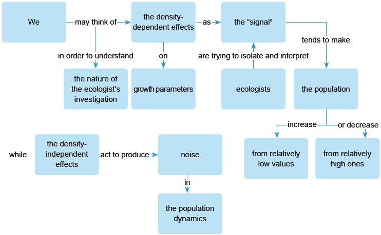 In order to understand the nature of the ecologist’s investigation, we may think of the density-dependent effects on growth parameters as the“signal” ecologists are trying to isolate and interpret, one that tends to make the population increase from relatively low values or decrease from relatively high ones, while the density-independent effects act to produce“noise” in the population dynamics.