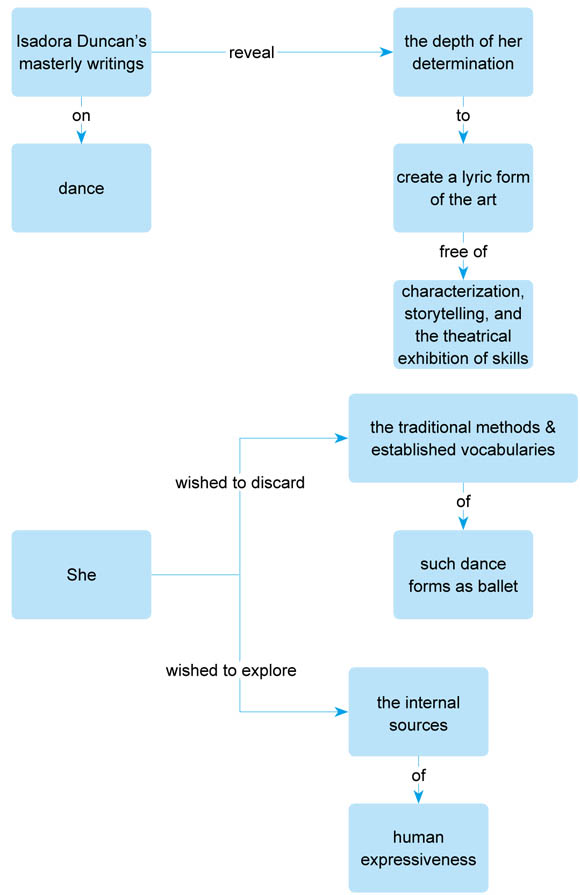 Isadora Duncan{关于舞蹈的精湛的}写作表现出她决心去创造一种舞蹈的抒情形式,这种形式中没有角色塑造,没有讲故事,也没有技术的戏剧性表现。她希望抛弃{像芭蕾舞这样的舞蹈形式中}传统的方法和已经建立的舞蹈语言,并且去探索人类表现力的内在源泉。