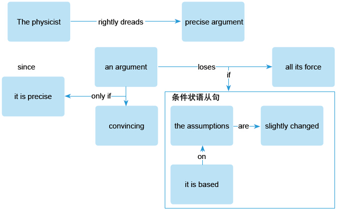 since表示因果关系,给出物理学家害怕做出精确论断的原因——精确论断很容易失效;whereas表示对比关系,对比了精确的论断和不精确的论断,在假设发生细微变动的情况下,精确的论断会失效,而不精确的论断依旧稳定。
