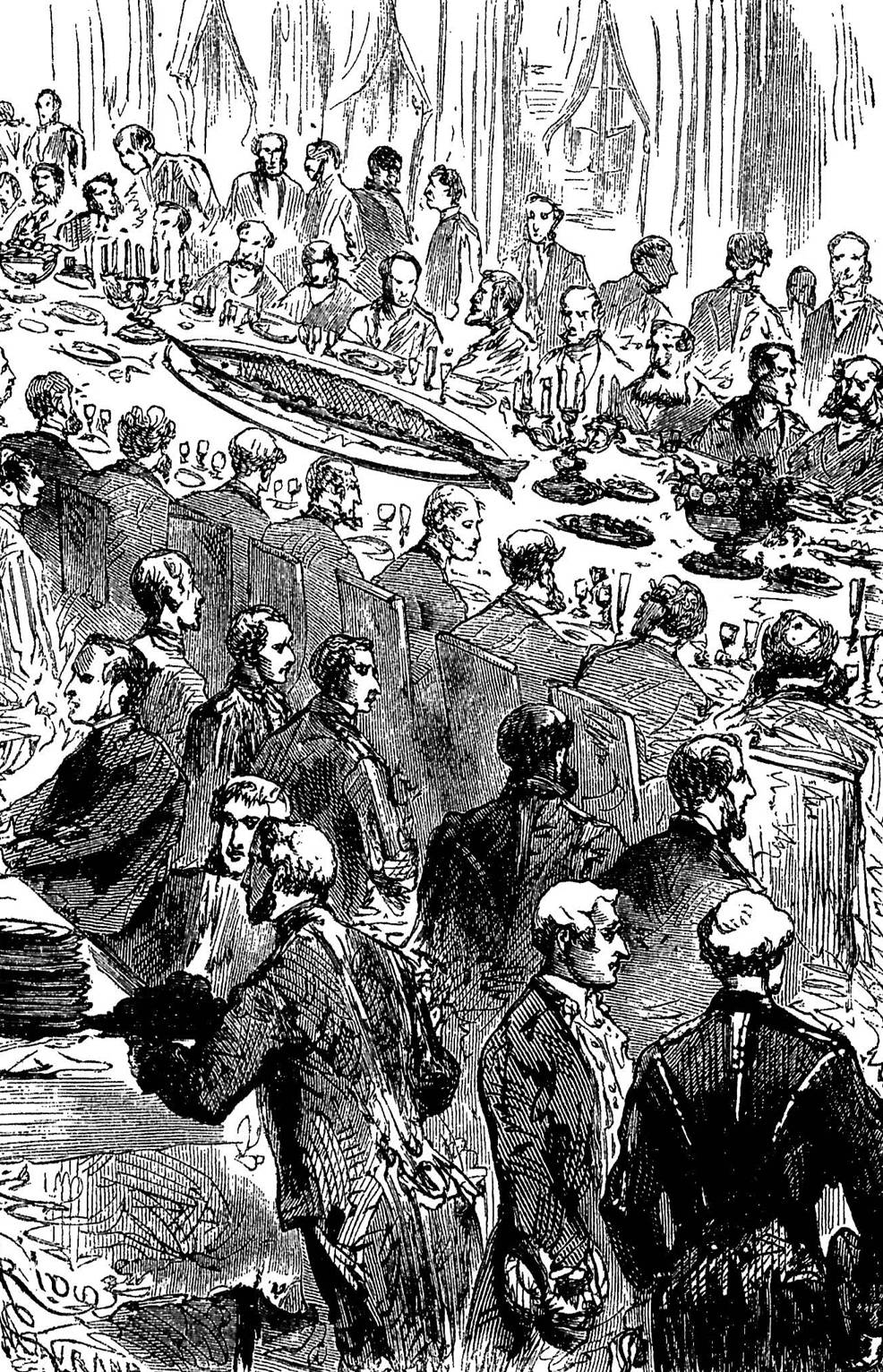 会后博士被接到位于帕尔马尔大街的旅行家俱乐部,那里已经摆好为他举行的盛大宴会;餐具的大小和客人的重要性是一致的,出现在盛宴上的那条鲟鱼,长度比塞缪尔·弗格森的身高差不了三寸。